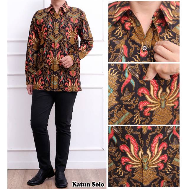 batik pria tangan panjang . bahan katun solo ( bahan menyerap keringat dan tidak berfuring / tidak pakai lapisan dalam ) bahan lembut , tidak luntur dan tidak menciut bila dicuci . ukuran M L XL